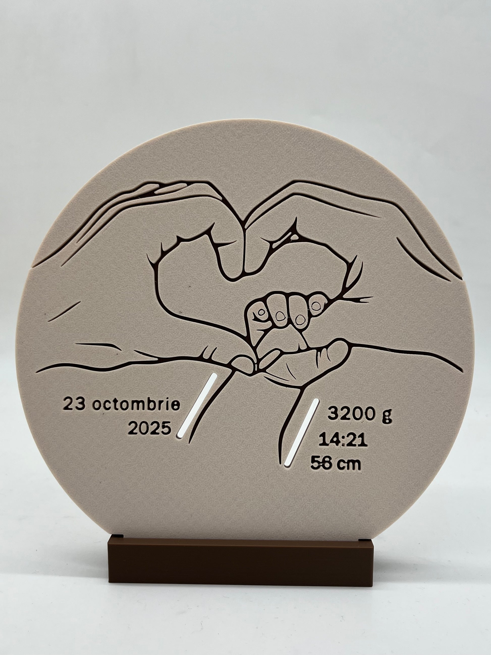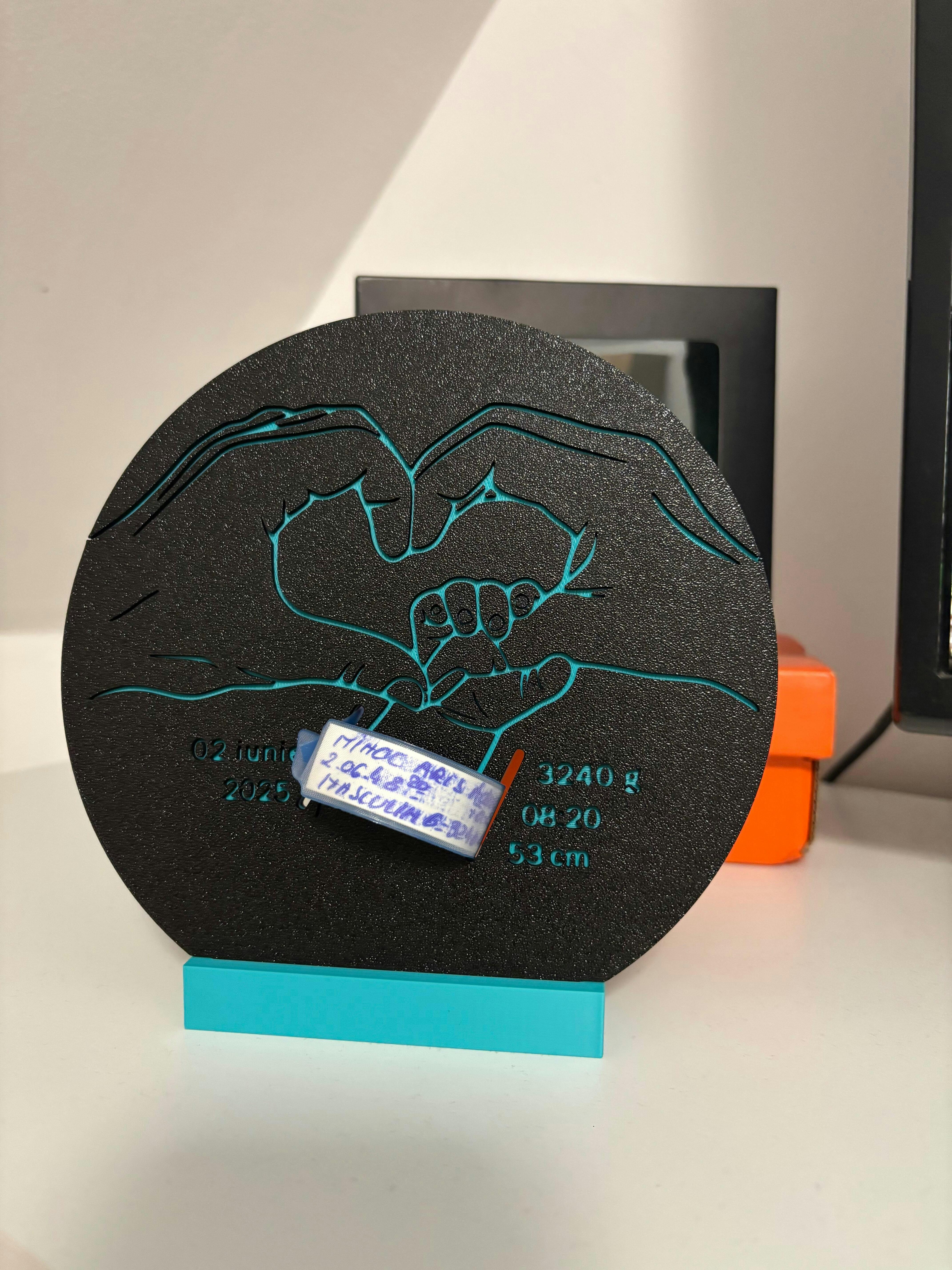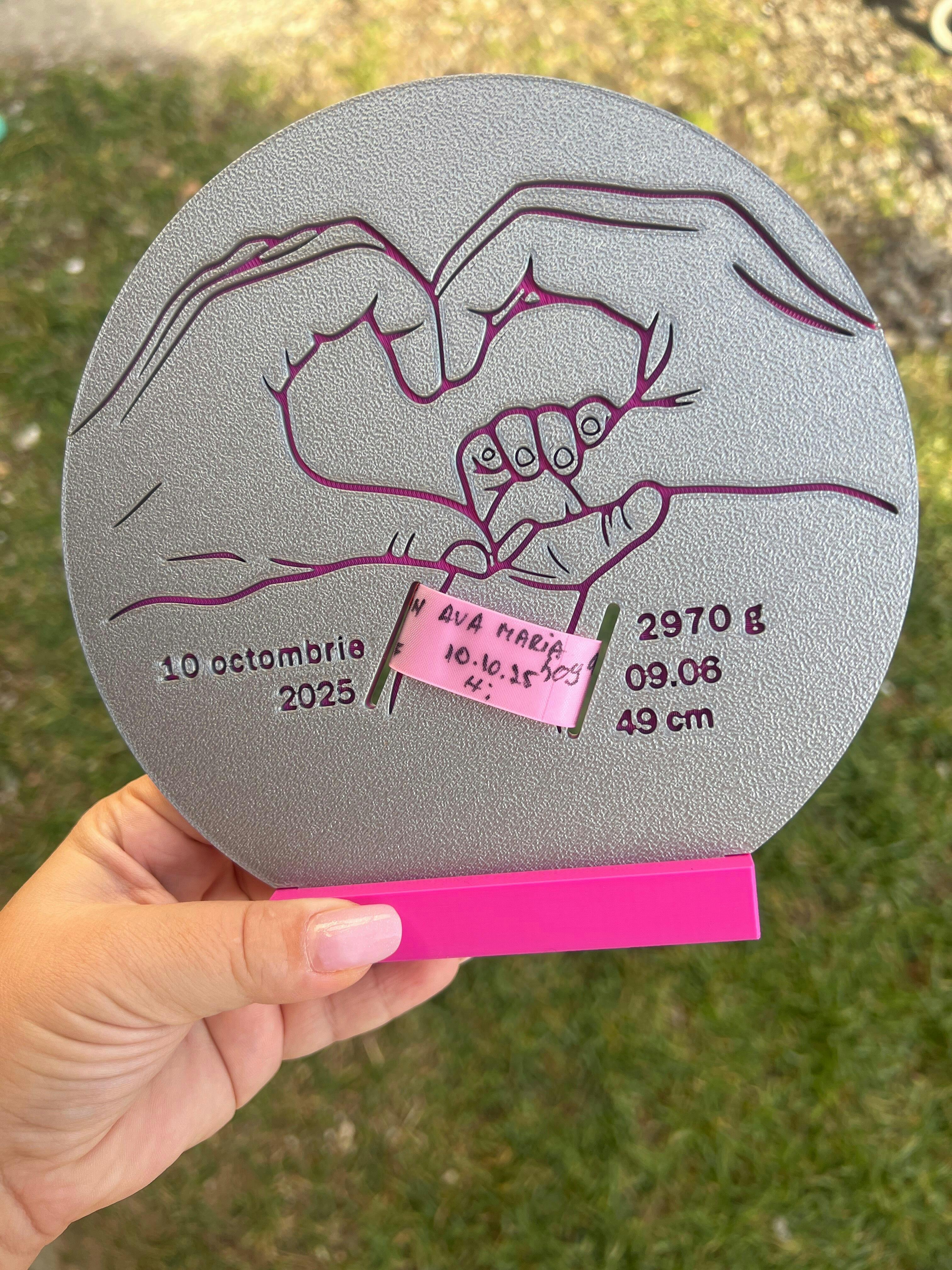 Păstrează pentru totdeauna una dintre cele mai prețioase amintiri din viață – prima brățară a bebelușului. Acest suport imprimat 3D este creat pentru a oferi o prezentare elegantă și emoționantă a brățării de maternitate, transformând-o într-un obiect de decor plin de semnificație.